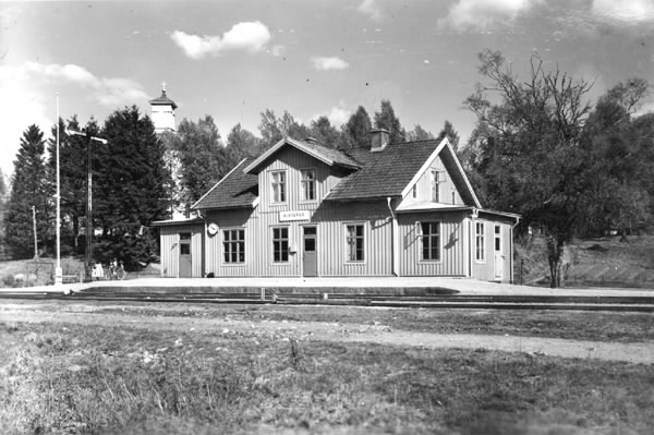 Älvsereds järnvägsstation sedd från spårsidan med Älvsereds kyrka bakgrunden. Stationen invigdes 1896, då "Pyttebanan" förlängdes från Fridhemsberg till Älvsered. Tre år senare förlängdes den ytterligare till Holsljunga och 1904 var banan framme i Limmared som slutstation.