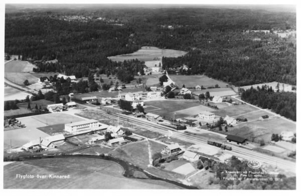 Flygfoto över Kinnareds bebyggelse och järnvägen genom samhället, där en å som slingrar sig i förgrunden. Foto: Lilljeqvist och man intygar att det är ett "Äkta fotografi". Kinnared fick sin järnvägsstation redan 1877 längs sträckan Halmstad-Värnamo, men från 1911 kunde man även nå orten via järnväg från Varberg via Ätran och Fegen.