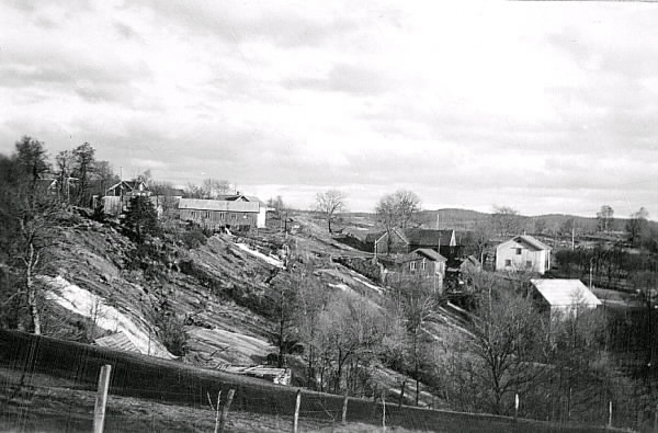 "Hoffors/Håfors, Gällinge och Idala." Tre bilder med vy över byn Håfors kring vattenfallen över berget, med kvarnen nedtill höger på första bilden. Bilderna hör till artikel i Hallands Nyheter publicerad 1944-12-21 med rubriken "Kommunikationerna bidraga till att lantbon stannar". Tillhör samlingen med fotokopior från Hallands Nyheter som är från 1930-1940-talen.
