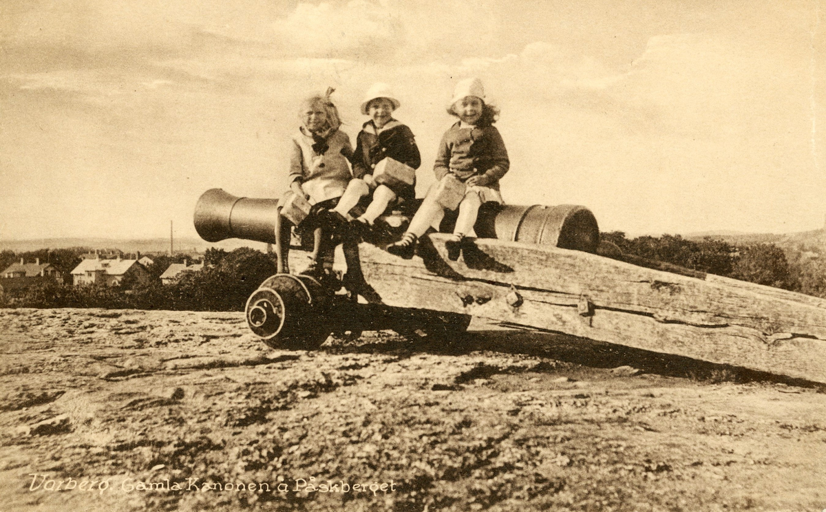 Kanonen på Gamla Påskberget. Tre små flickor med spånkorgar sitter på kanonen. Den är sista kanonen på fästningen som såldes på offentlig auktion 1897 och ropades in av skeppsmäklare Gustaf Magnusson. Han och fem andra män skänkte den till Varbergs stads plantering som placerade kanonen på Påskbergets utkiksplats samma år, senast i början av september. Platsen har därefter kallats "Kanonberget".