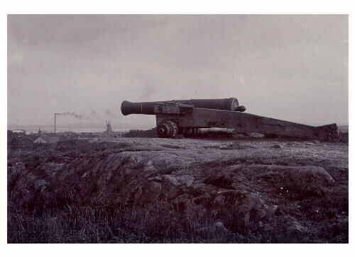 Sista kanonen på Varbergs fästning, uppställd på Gamla Påskberget. Den såldes på offentlig auktion 1897, inropades av skeppsmäklare Gustaf Magnusson som lät skänka den till staden som placerade den här senare samma år.