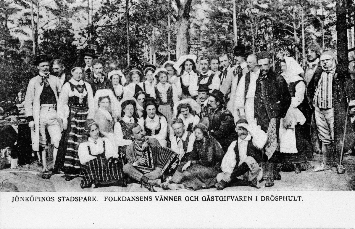 Jönköpings stadspark. Gruppbild av "Folkdansens vänner och gästgifvaren i Drösphult".