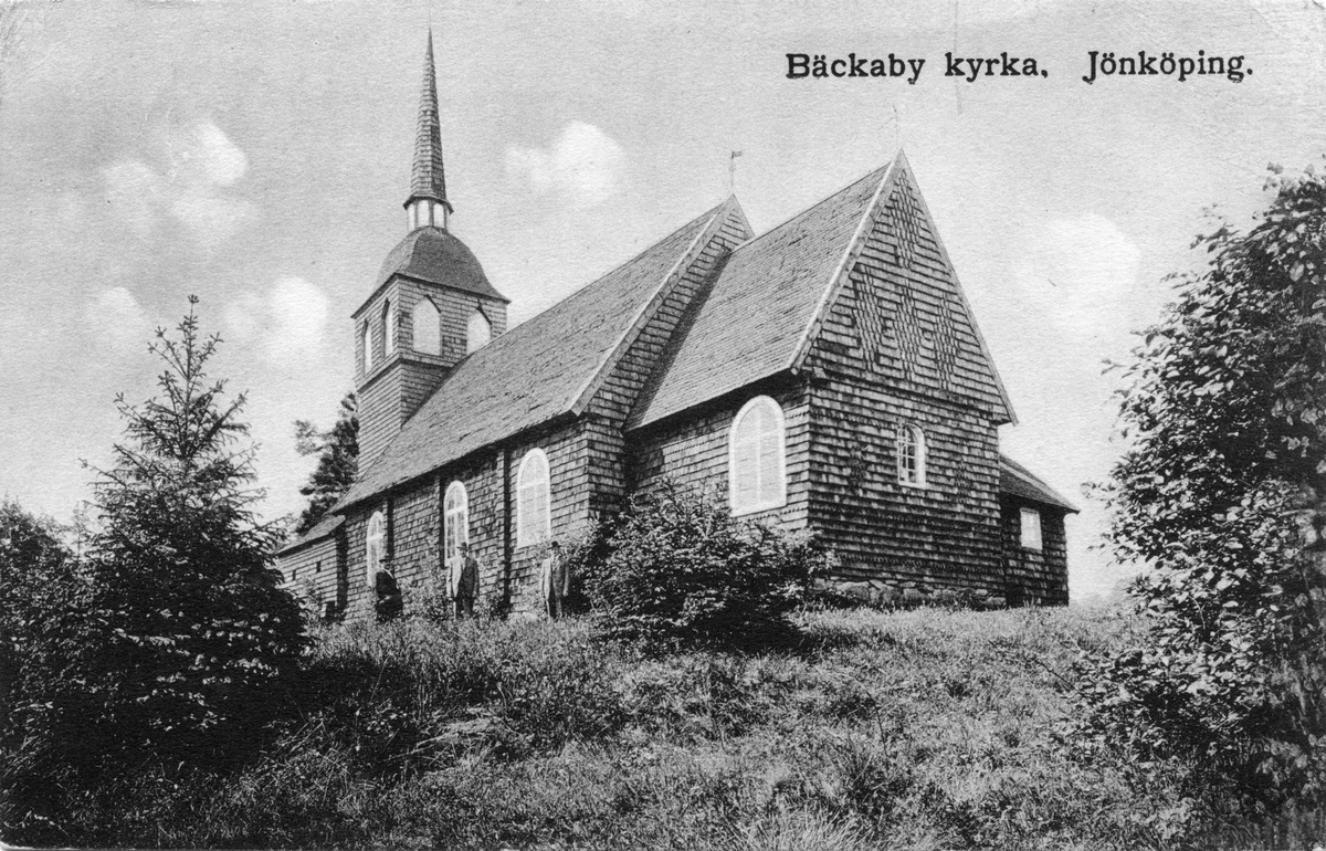 Den gamla träkyrkan köptes in av en privatperson och återinvigdes den 31 augusti 1902 i Jönköpings stadspark efter att ha flyttats dit från Bäckaby utanför Vetlanda 1902. De äldsta delarna av kyrkan var från 1320-talet. Sent på fredagskvällen den 28 april år 2000 totalförstördes kyrkan i en brand.
