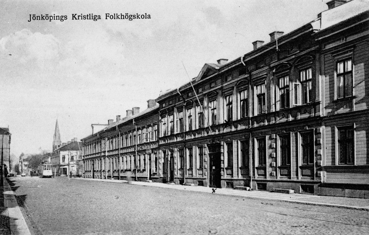 Titel: Jönköpings Kristliga Folkhögsskola vid Klostergatan söder om Kungsgatan. En spårvagn står vid korsningen.