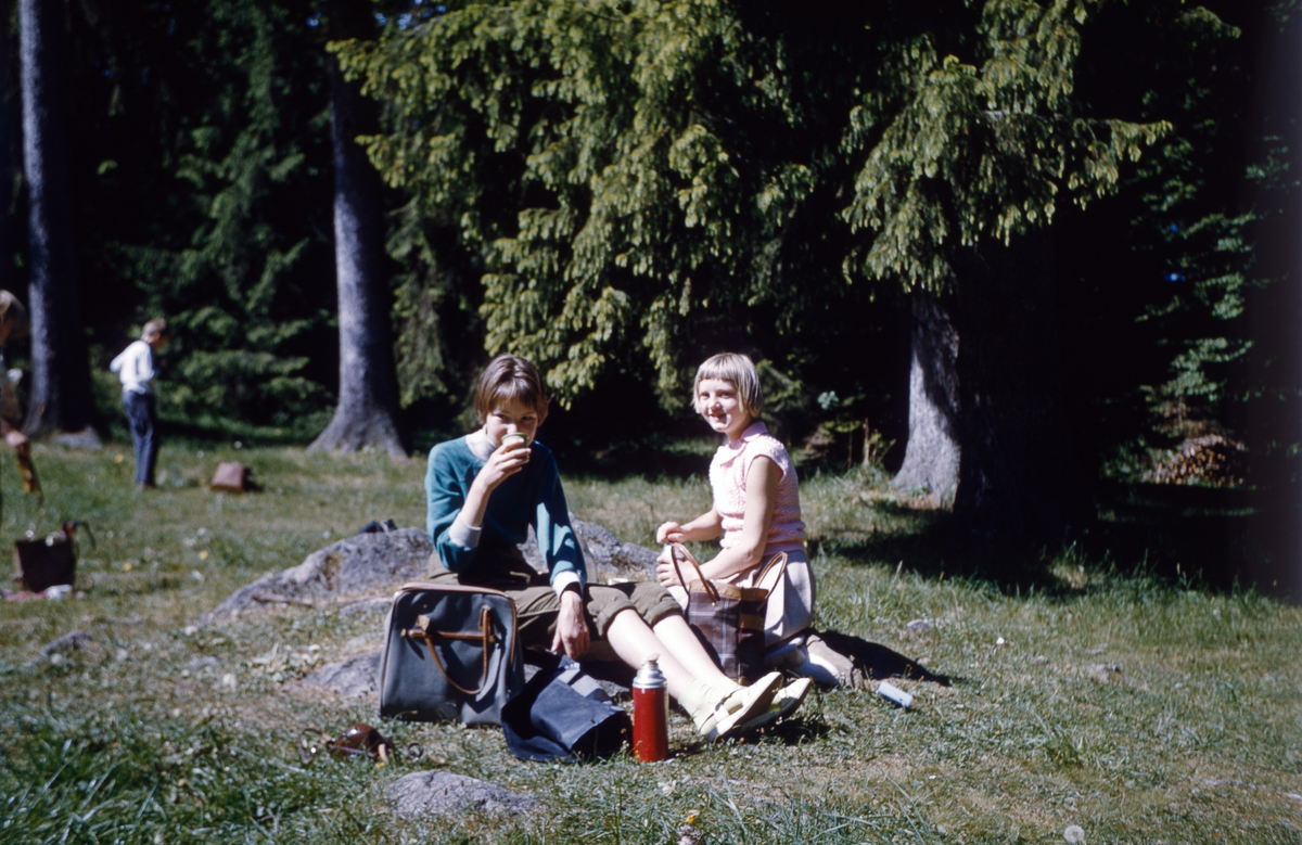 År 1959 på våren är klass 4 från Österängsskolan i Jönköping på skolresa till Vadstena tillsammans med sin lärare Göte Ohlsson. På vägen dit är det fikapaus, på bilden Christina Vadfors och Elvira Sommer.