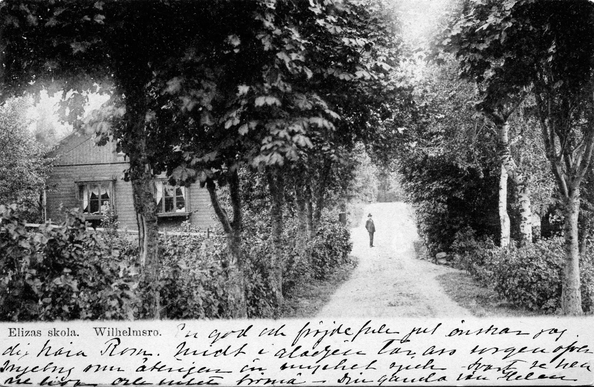 Elizas skola, Wilhelmsro, Jönköping. Ebba Gustava Ramsay, född 1828 död 1922, grundläggare av epileptikeranstalten Vilhelmsro, lät 1882 uppföra en skola med stöd från Eliza Hornbuckle, Skottland. Brefkort till Stockholm 1905-12-30.
