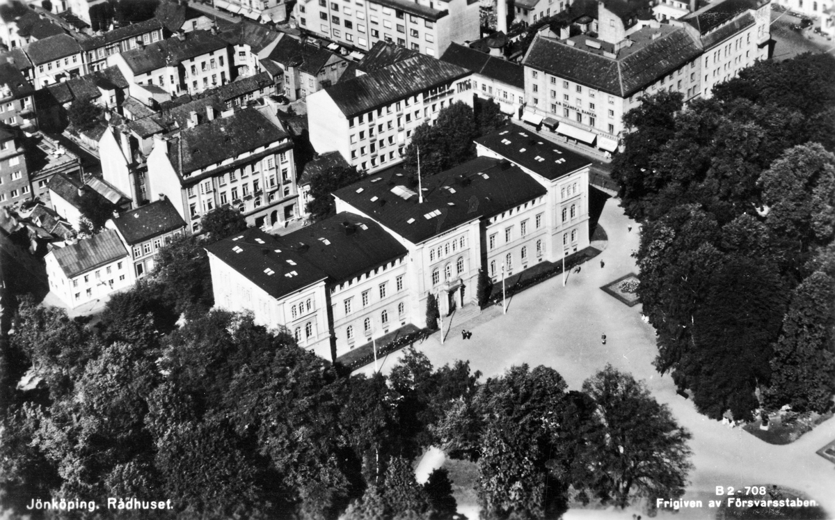 Titel: Flygfoto över Rådhuset i Rådhusparken i Jönköping.