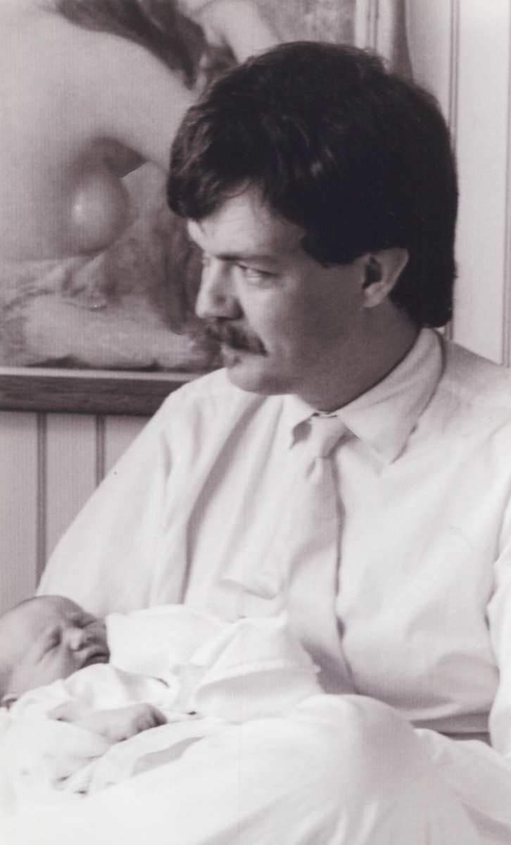 "Manne" Ekman (född 1955) håller sin nyfödda dotter Emelie i famnen, Sahlgrenska KK i Götebrg, juni 1987.