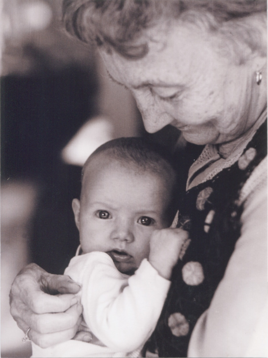 Mary Ekman håller sitt femte barnbarn Emelie Ekman (född 1987) i famnen, Bråtabron, Blekinge, oktober 1987.
