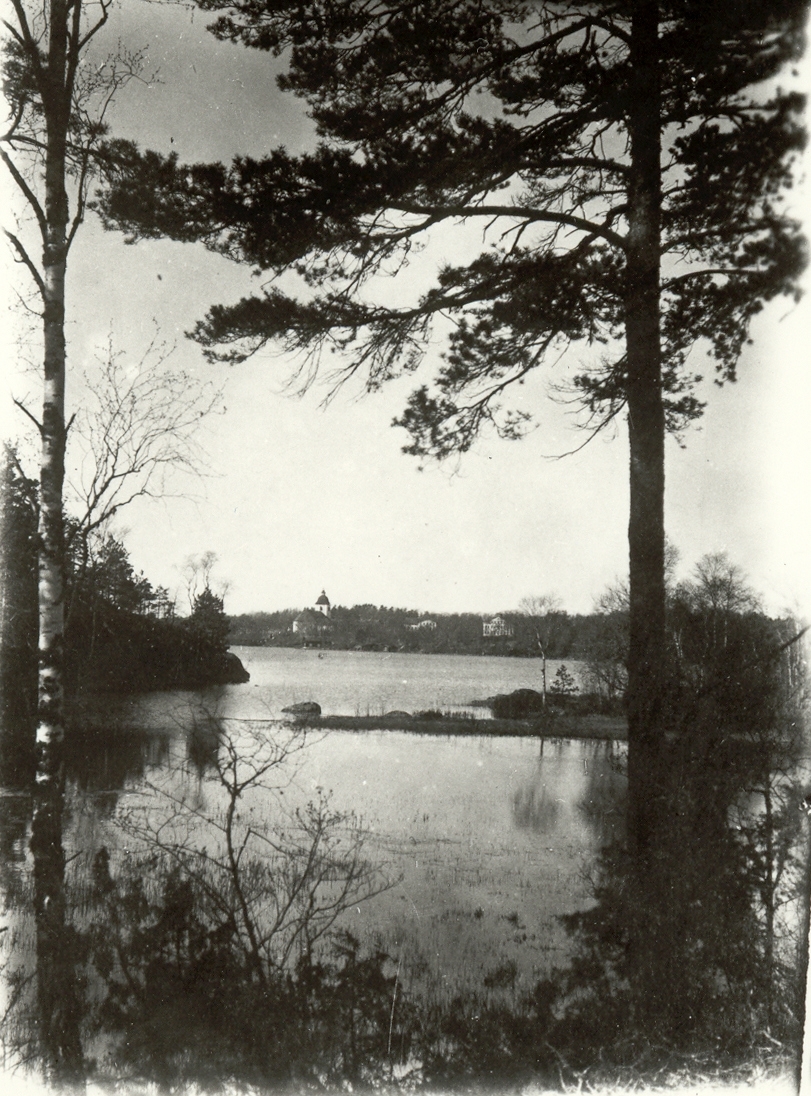 Vy över sjön Hjorten. I bakgrunden skymtas Hjorteds kyrka.