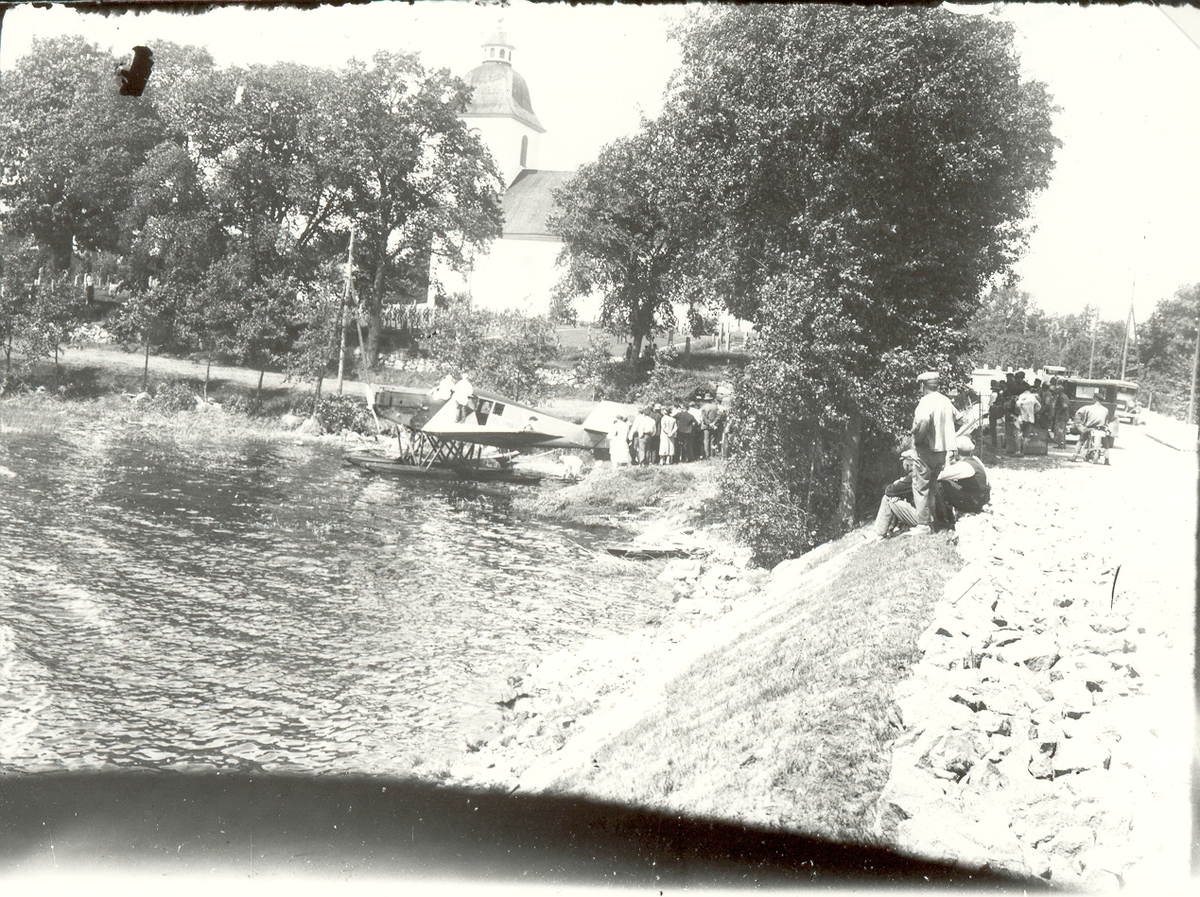 Flygplan på vattnet samlar bygdens befolkning. Pontonflyglan.