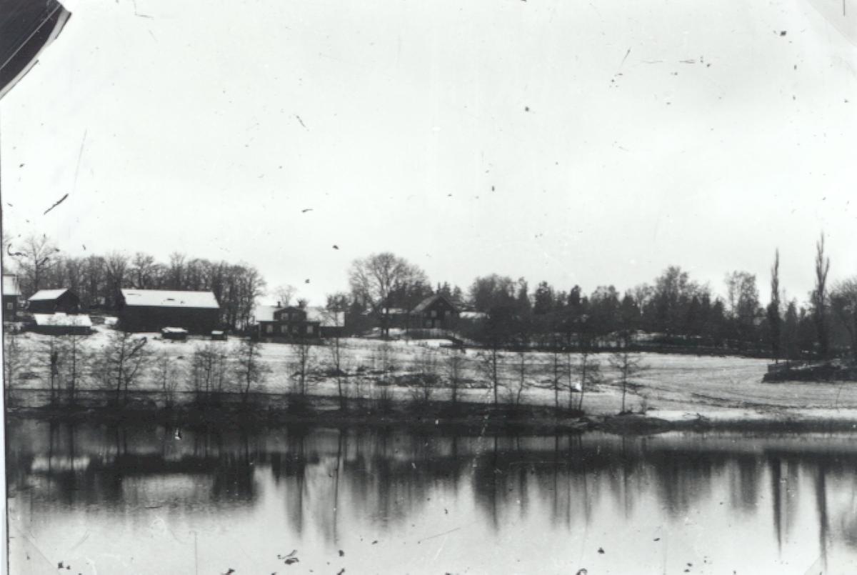 Vy från Hjorted med prästgården och kyrkogården till höger.