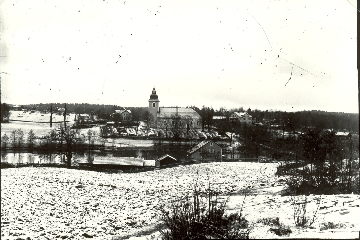 Vy över orten Hjorted med kyrkan i bakgrunden.