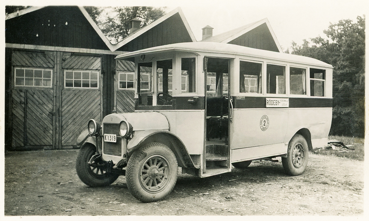 På bussen sida kan man läsa: "Rödeby-Rörsmåla-Ledja" och firmanamnet (otydligt).