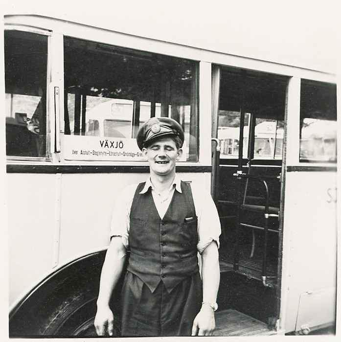En man i skjorta, väst och skärmmössa står framför en SJ-buss trol. i närheten av järnvägsstationen, Växjö.