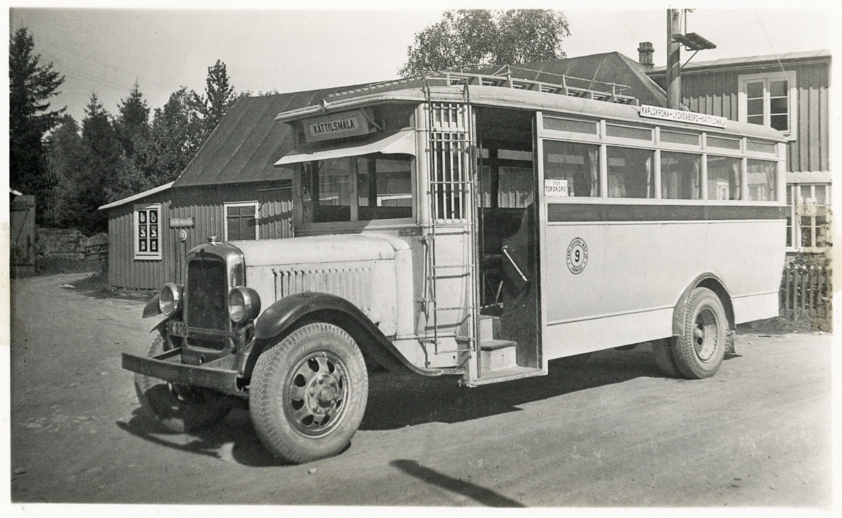 På bussens sida kan man bl a läsa: "Karlskrona-Lyckeåborg-Kättilsmåla" och firmanamnet (otydligt).