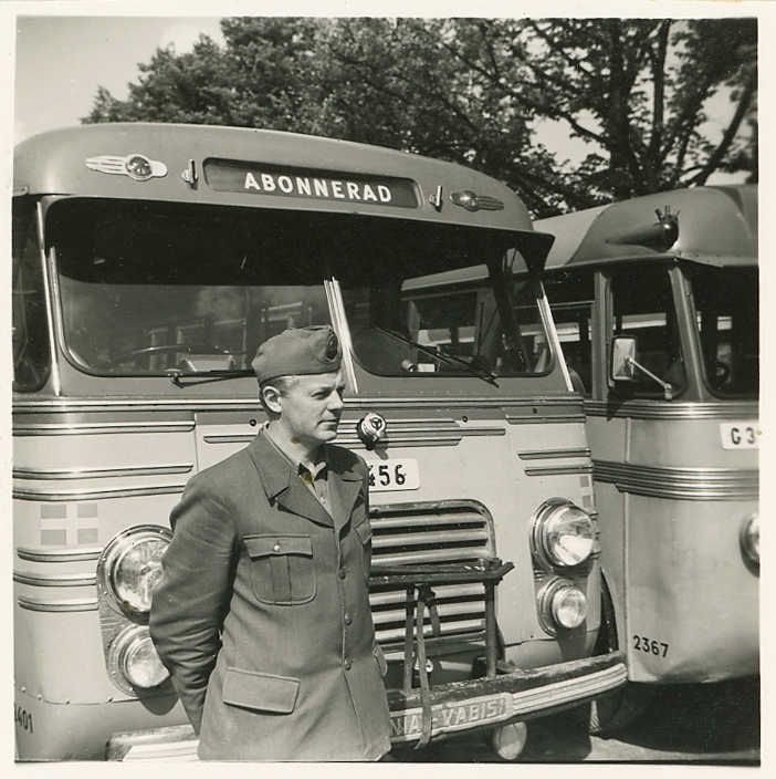 En chaufför i kavaj och båtmössa står framför några SJ-bussar , trol. på busstorget/järnvägsplan i Växjö.