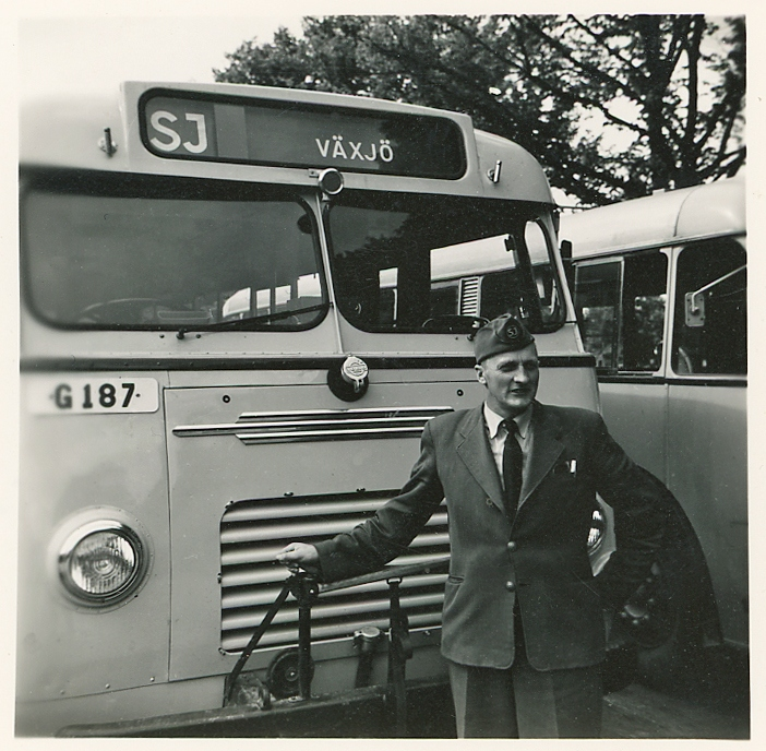 En chaufför i kavaj och båtmössa poserar framför några SJ-bussar, trol. på busstorget/järnvägsplan i Växjö.