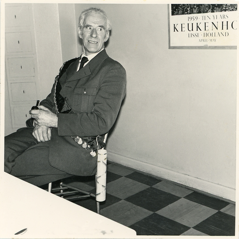En leende man i busschaufförsuniform utrustad med diverse dekorationer. Han sitter med pipa i handen, trol. vid någon form av avtackning.
