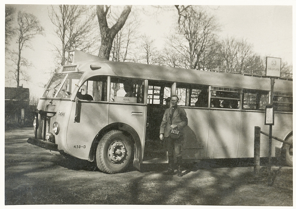 En SJ-buss har stannat till vid en hållplats i, eller nära Växjö. Chauffören står vid sidan av bussen. Några passagerare skymtar.