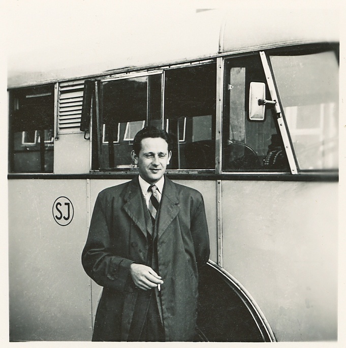 En chaufför klädd i rock med kostym och slips står invid en SJ-buss med en cigarett i handen, trol. på busstorget/järnvägsplan vid järnvägsstationen, Växjö.