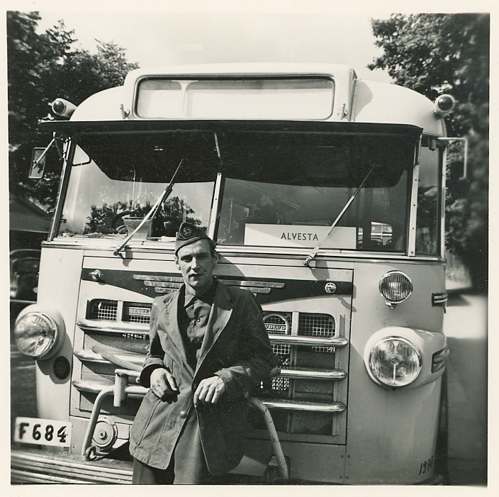 En chaufför i uniformskavaj och skärmmössa poserar framför en SJ-buss , trol. på Norra Järnvägsgatan i närheten av busstorget/järnvägsplan i Växjö.