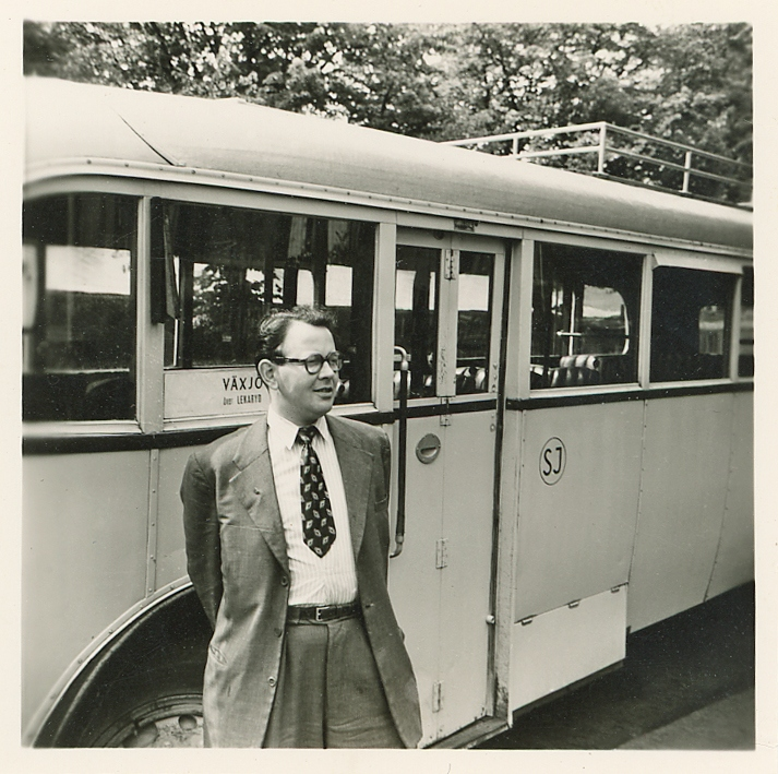 En chaufför i kavajkostym, slips och glasögon poserar bredvid en SJ-buss, möjl. på busstorget/järnvägsplan i Växjö.