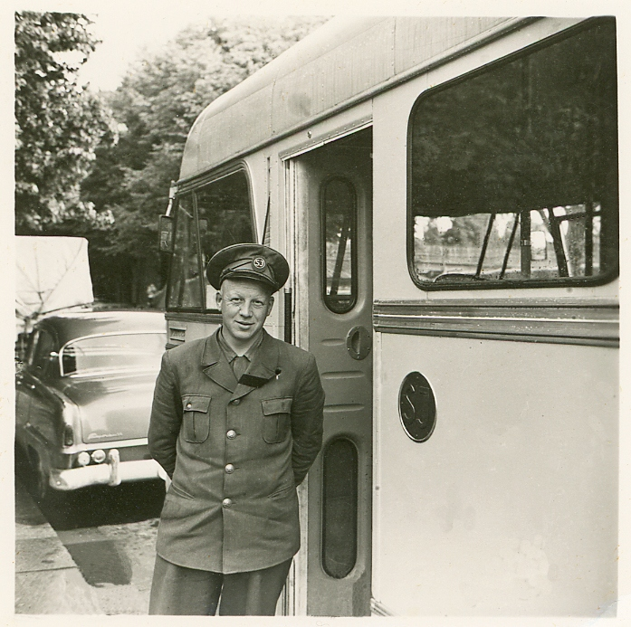 En chaufför i uniformskavaj (med sorgband) och skärmmössa står vid sidan av en SJ-buss på Norra Järnvägsgatan, i närheten av busstorget/järnvägsplan i Växjö. I bakgrunden skymtar gångbron över järnvägen.