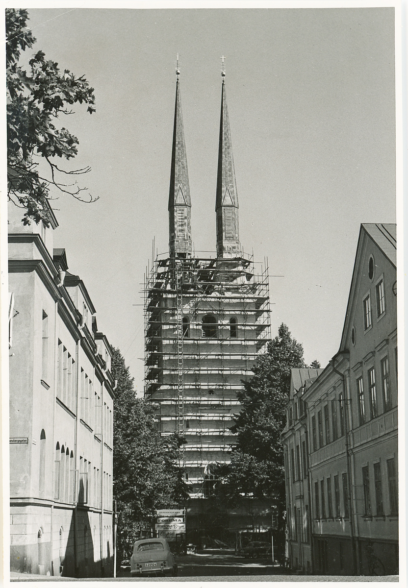 Sandgärdsgatan mot öster, i korsningen mot Kronobergsgatan. I bakgrunden ser man domkyrkans torn med de nya tornspirorna.