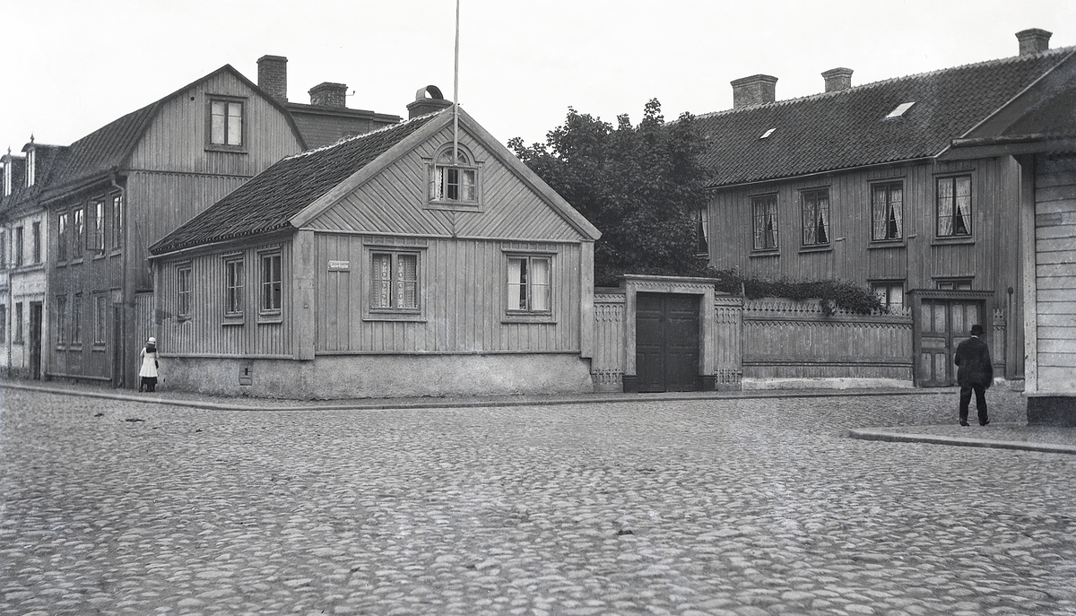 Bostadshus m.m. i ett gathörn i Karlskrona (?). På gatuskylten kan man läsa: "Gasverksgatan".