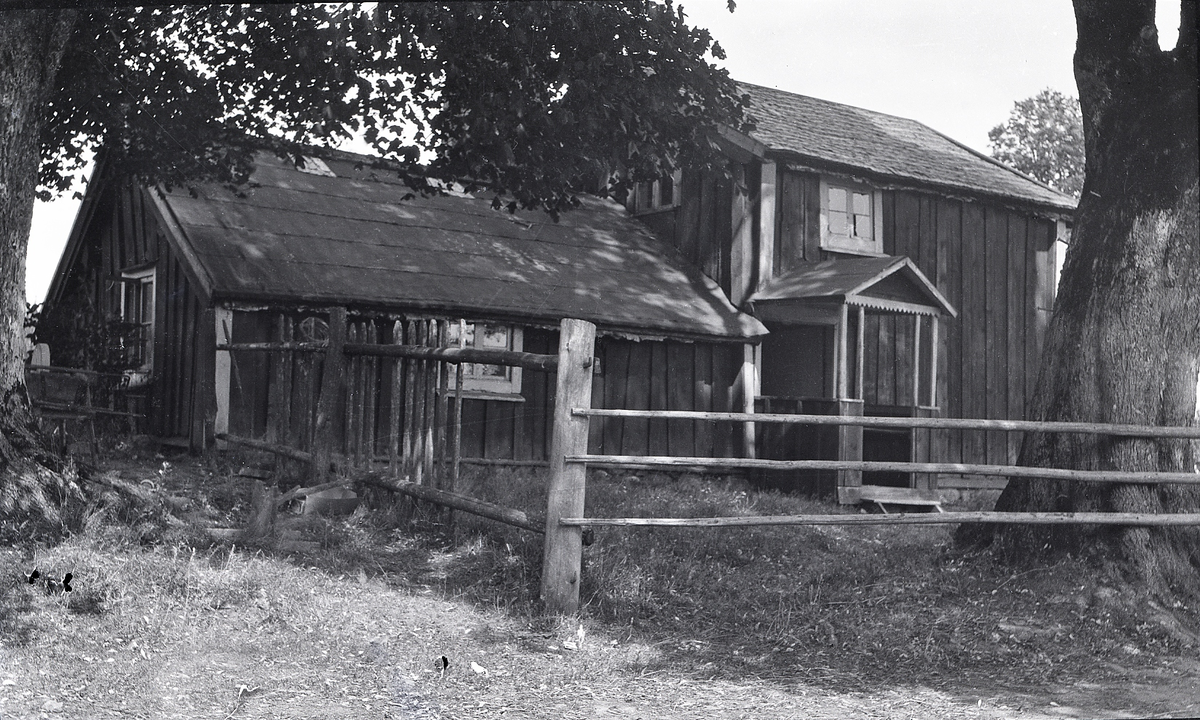 Man ser framsidan av ett torp byggt i s.k. sydgötisk stil med en lägre och en högre byggnad.