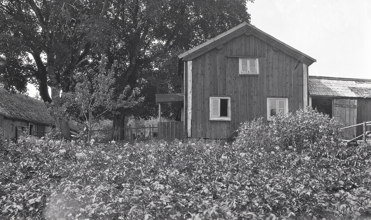 Man ser ena gaveln av torpet. Till vänster syns en ladugård.