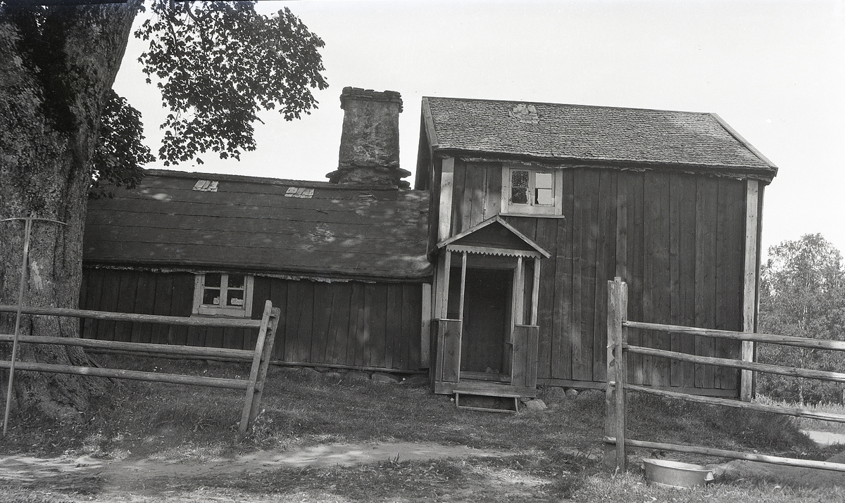 Man ser framsidan av ett torp byggt i s.k. sydgötisk stil med en lägre och en högre byggnad.