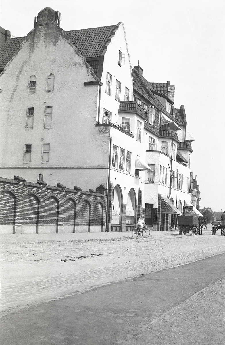 Framsidan av ett större reveterat flerfamiljshus med en rad affärer nederst. Man ser en skylt med text: "J. Bergh....".