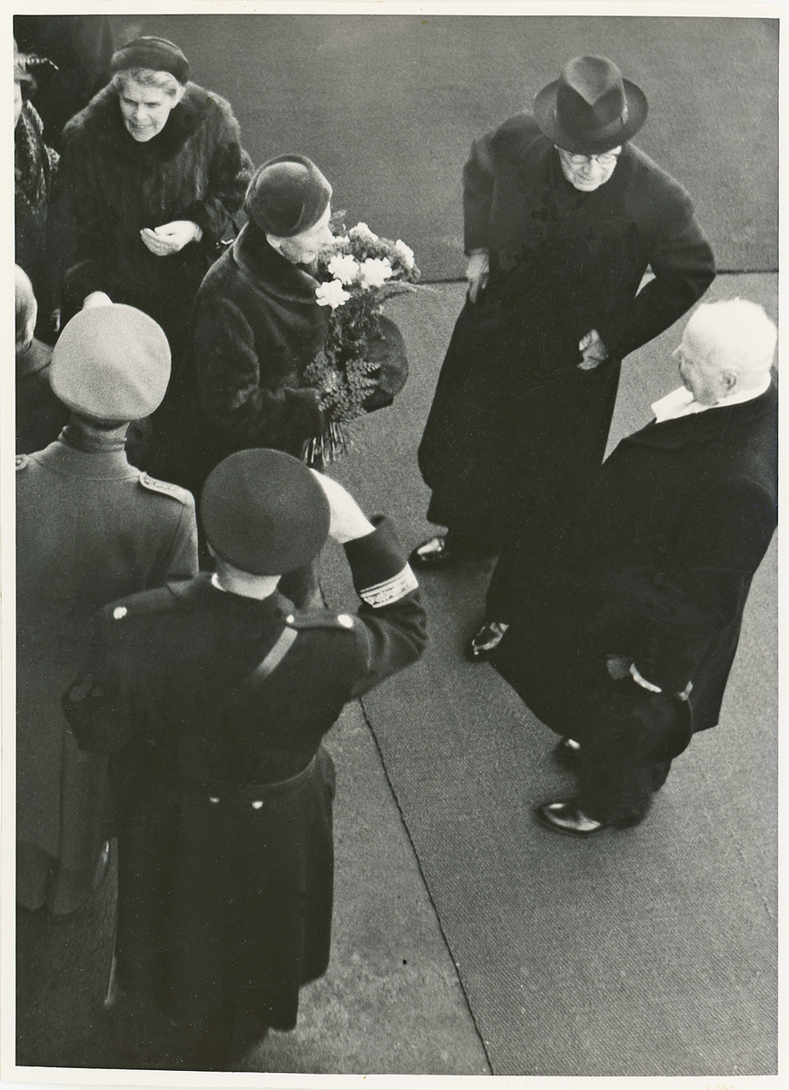 Kung Gustaf VI Adolf och drottning Louise i samtal med landshövding Bergquist på perrongen till järnvägsstationen.
