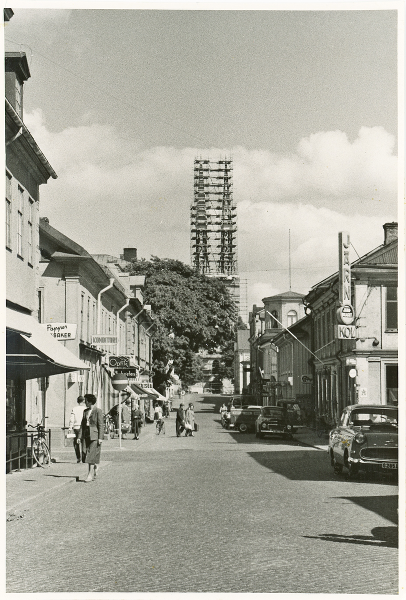 Sandgärdsgatan mot öster, i korsningen mot Klostergatan. I bakgrunden ser man domkyrkospirorna under uppbyggnad.