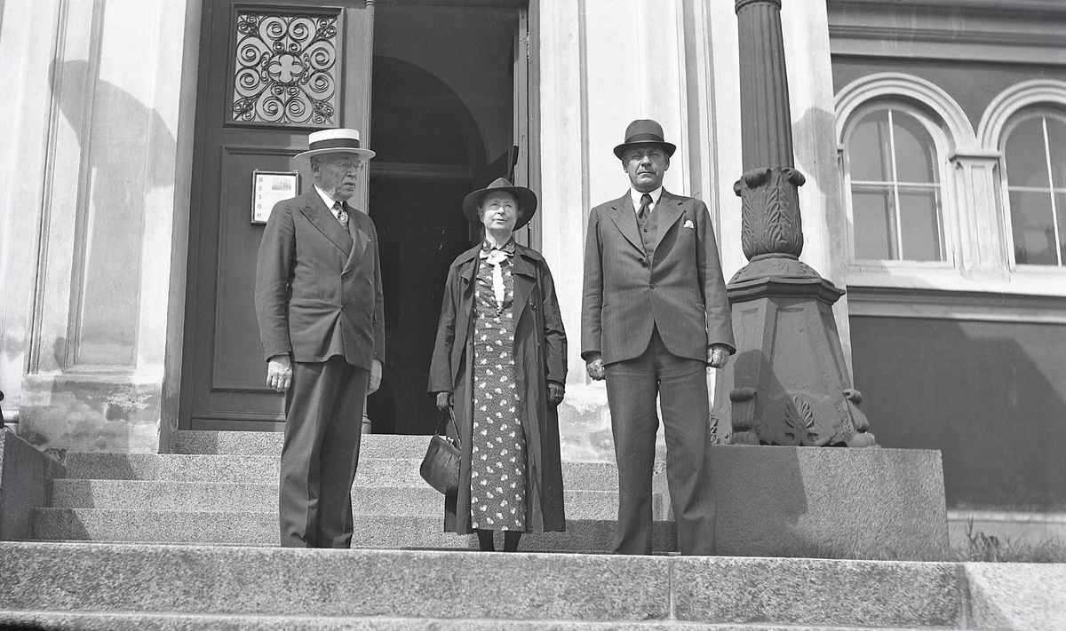 Tre personer på entrétrappan till den gamla huvudingången på Smålands museum, den 7 augusti 1939.