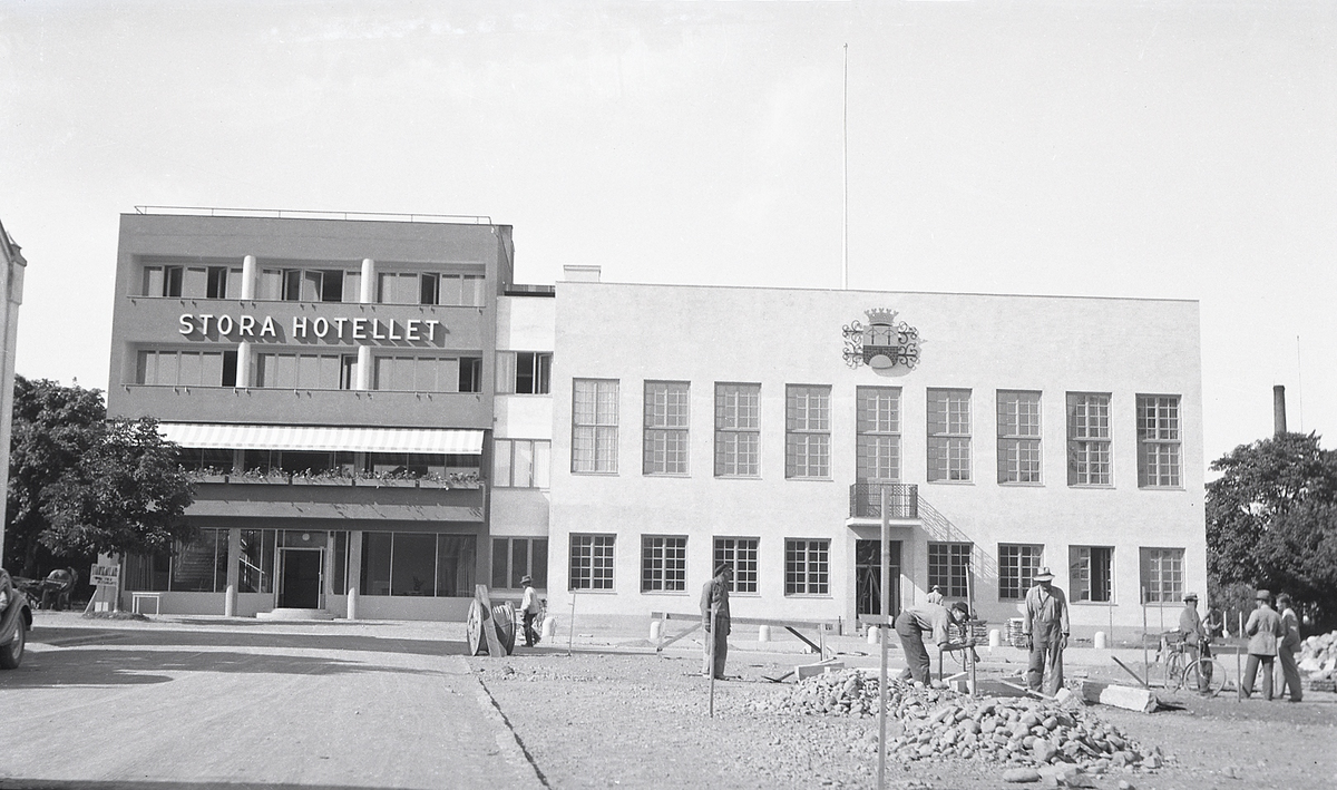 Stora hotellet och det nya stadshuset i Nybro, 1935. Man håller på att stenlägga torget och lägga ner diverse ledningar.