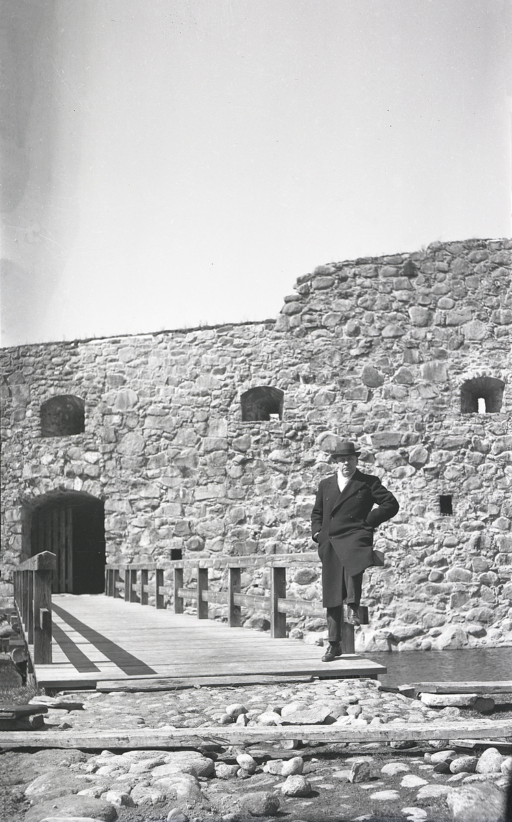 Landshövding August Beskow på bron mot södra porten till Kronobergs slottsruin utanför Växjö.