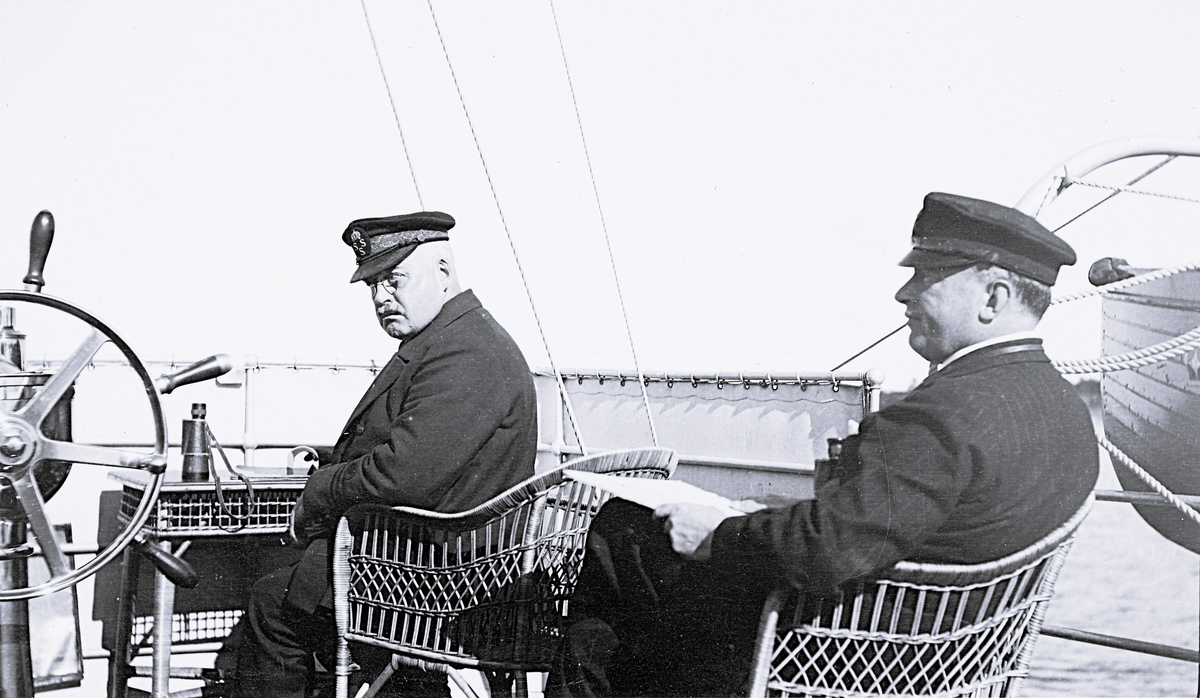 Titel: Två män med skepparmössor ombord på ångjakten Tritonia. Text i album: "Utfärd med "Tritonia" till Marö, 1924".