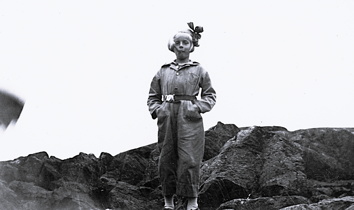 En flicka som står vid en klipphäll med rosett i håret.