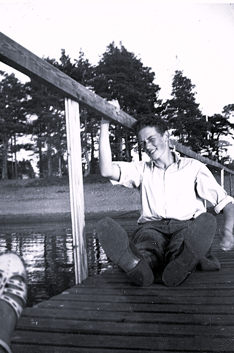 Ung man sitter på en brygga med en strand och skog i bakgrunden.