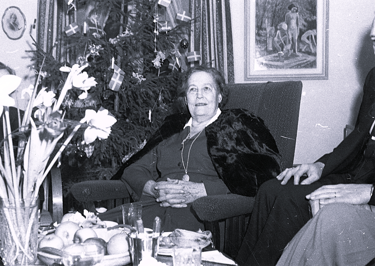 Foto av en kvinna i juletid. Text baksida kort: "Farmor".