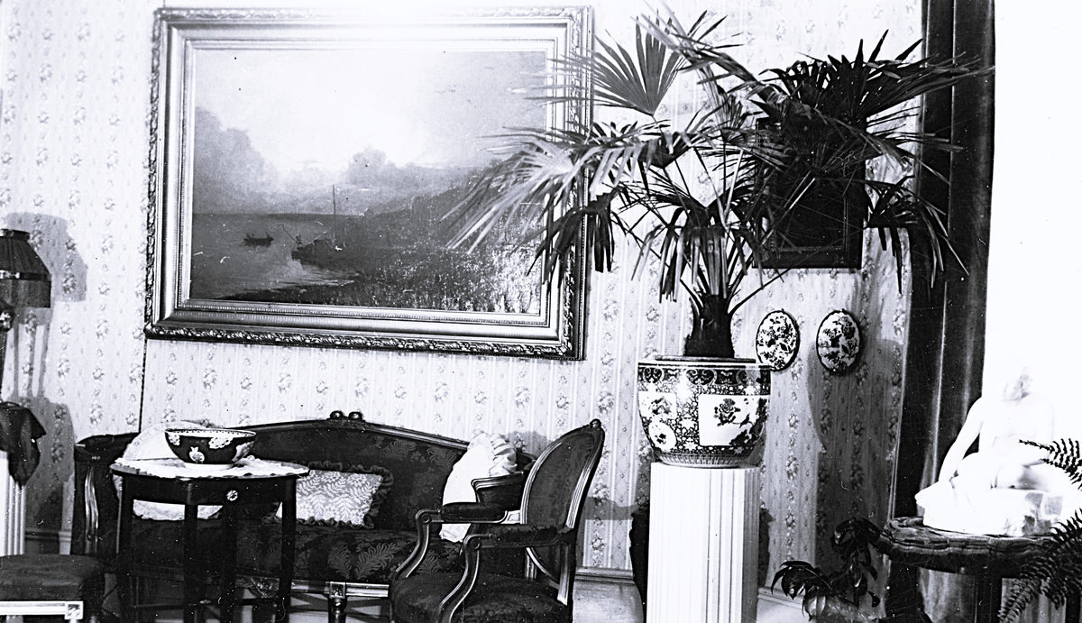 Ett rum med en tavla, soffa, bord och stolar samt en krukväxt på en piedestal. Text i album: "Vårt hem - Salongen".