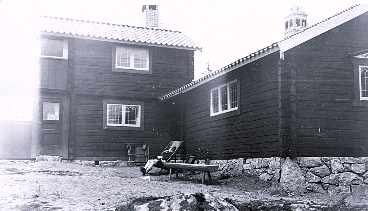 En byggnad i trä med spröjsade fönster och en kvinna som sitter i en solstol och vilar. Text i album: "Kårgården" juli 1928.