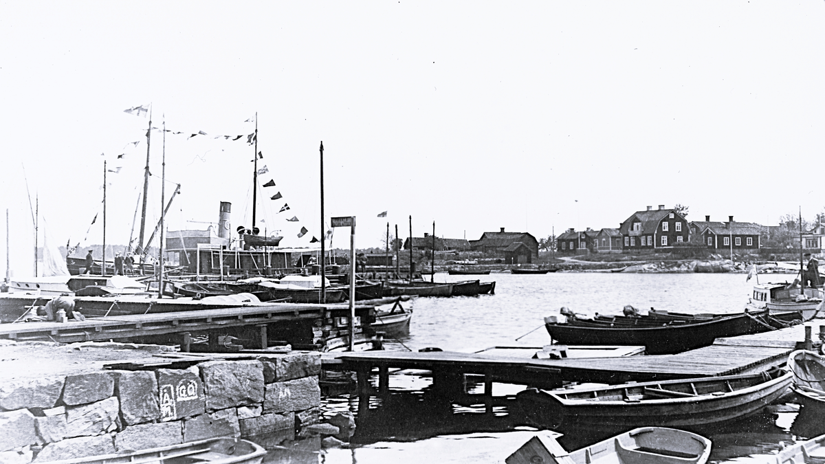 Båtar av alla de slag som ligger förtöjda vid båtbrygga i Öregrund samt i bakgrunden syns byggnader. Text i album: "Öregrund 1927".