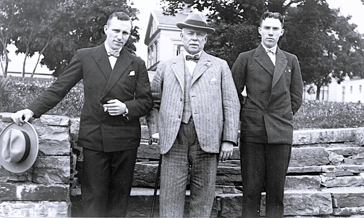 Tre män som står framför en låg mur vid en park med en byggnad och träd i bakgrunden. Text i album: "I "vår park" sommaren 1928".