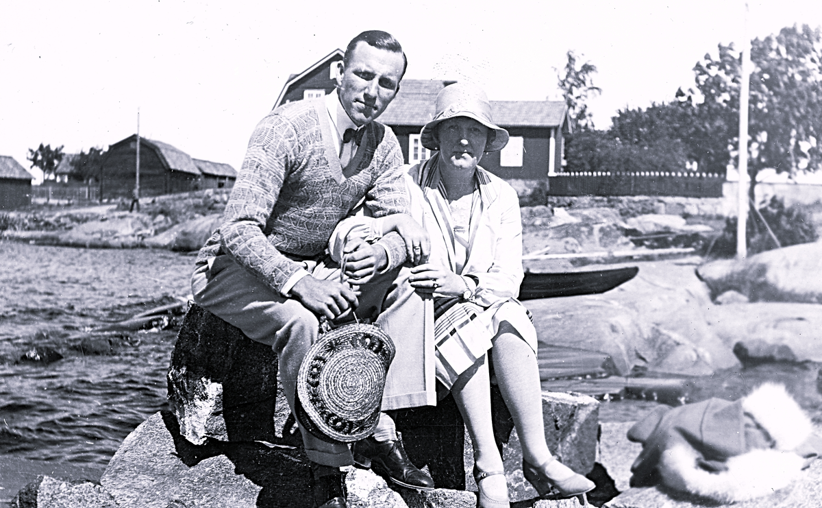 Ett par som sitter på stenklippor, med hav och byggnader i bakgrunden. Text i album: "Sommaren 1928 i Öregrund".