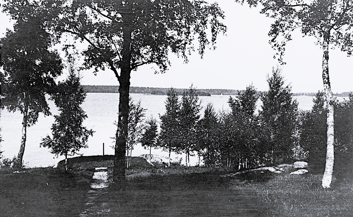 Utsikt över havet med tomt, träd och en gång ner mot vattnet i förgrunden. Text i album: "Marö, 1924".