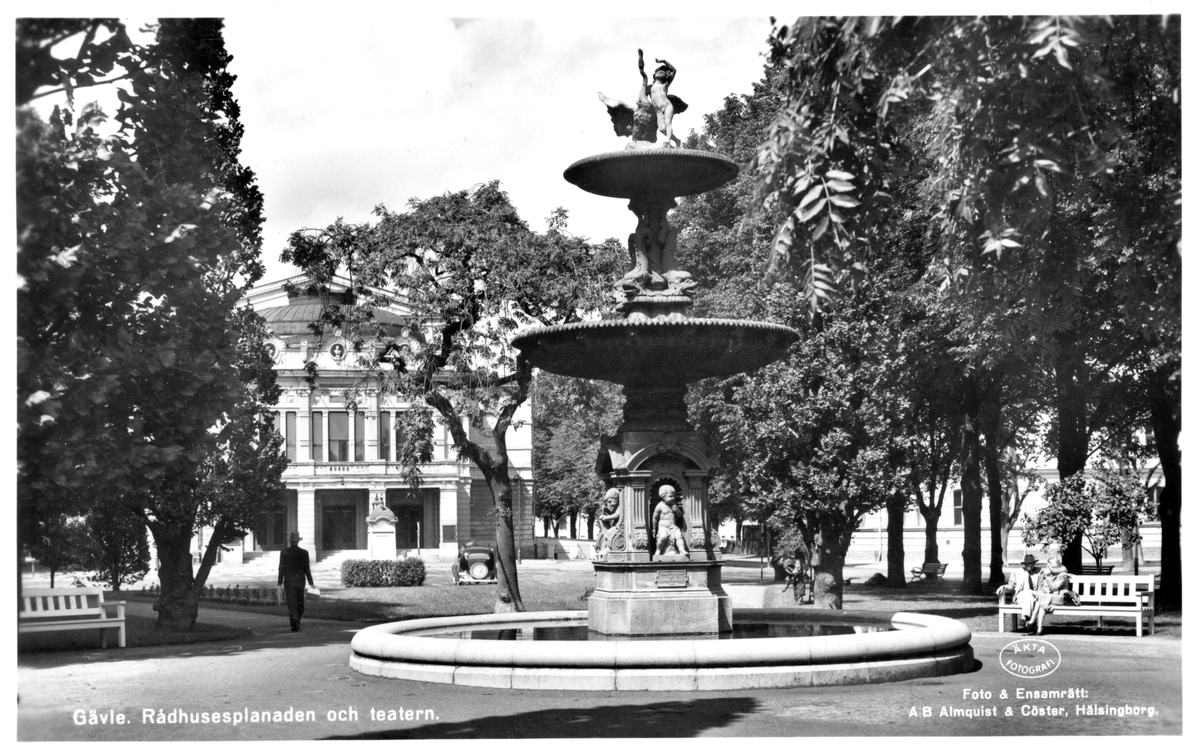 Vykort med motiv från Rådhusesplanaden och teatern, Gävle. Handskrivet medelande på baksidan med frimärke och poststämpel.